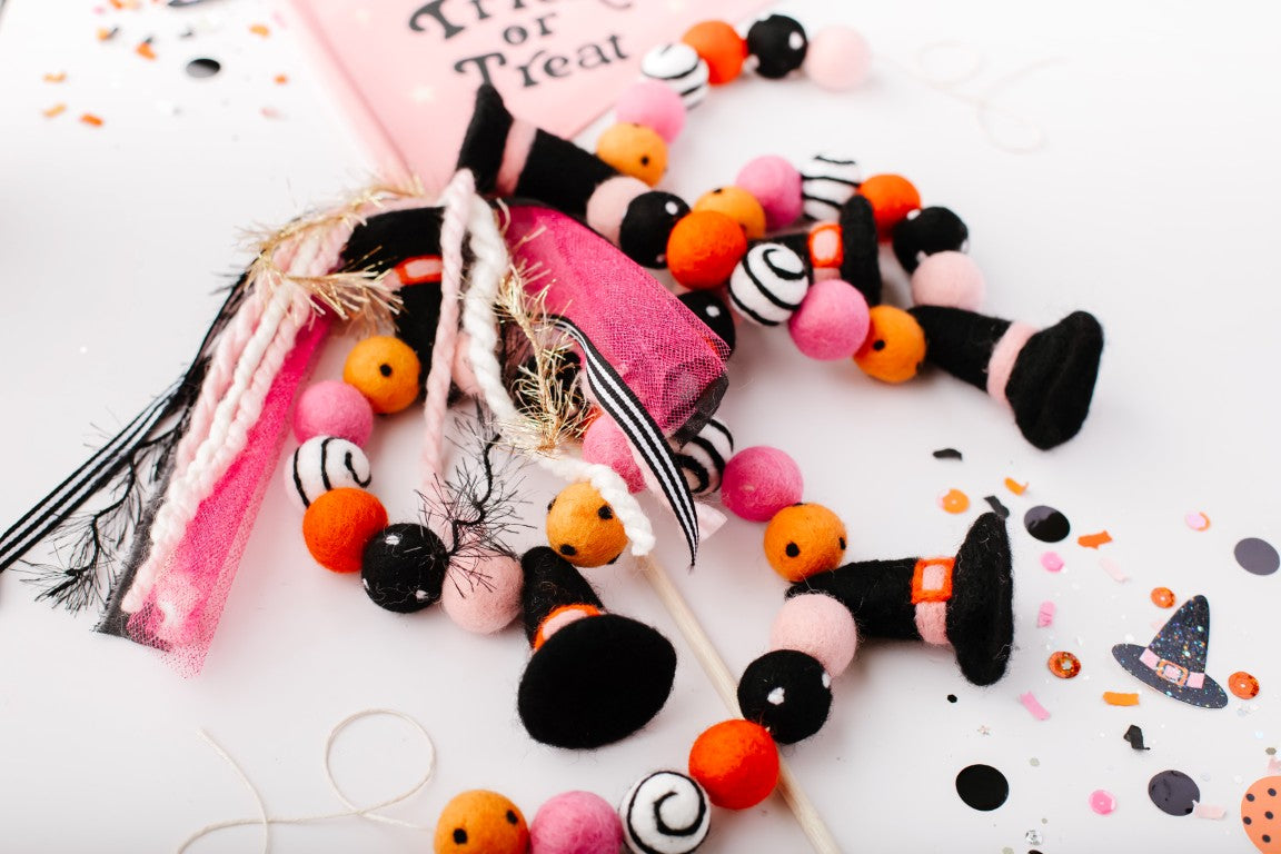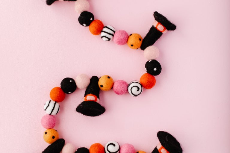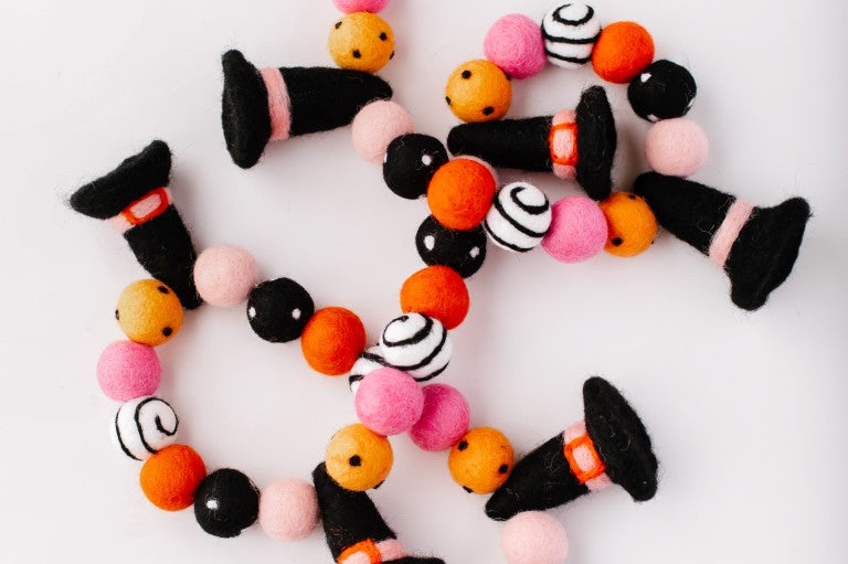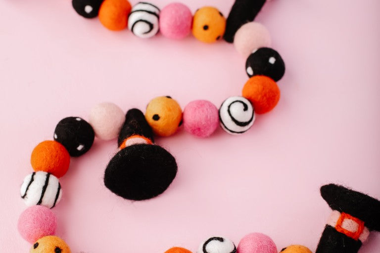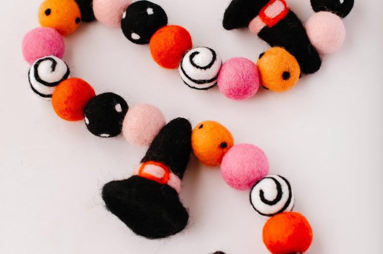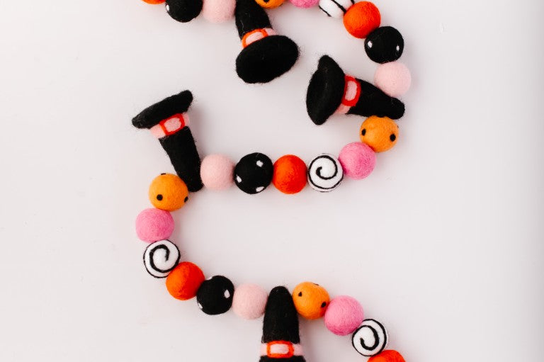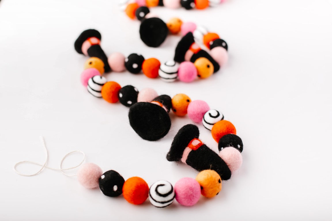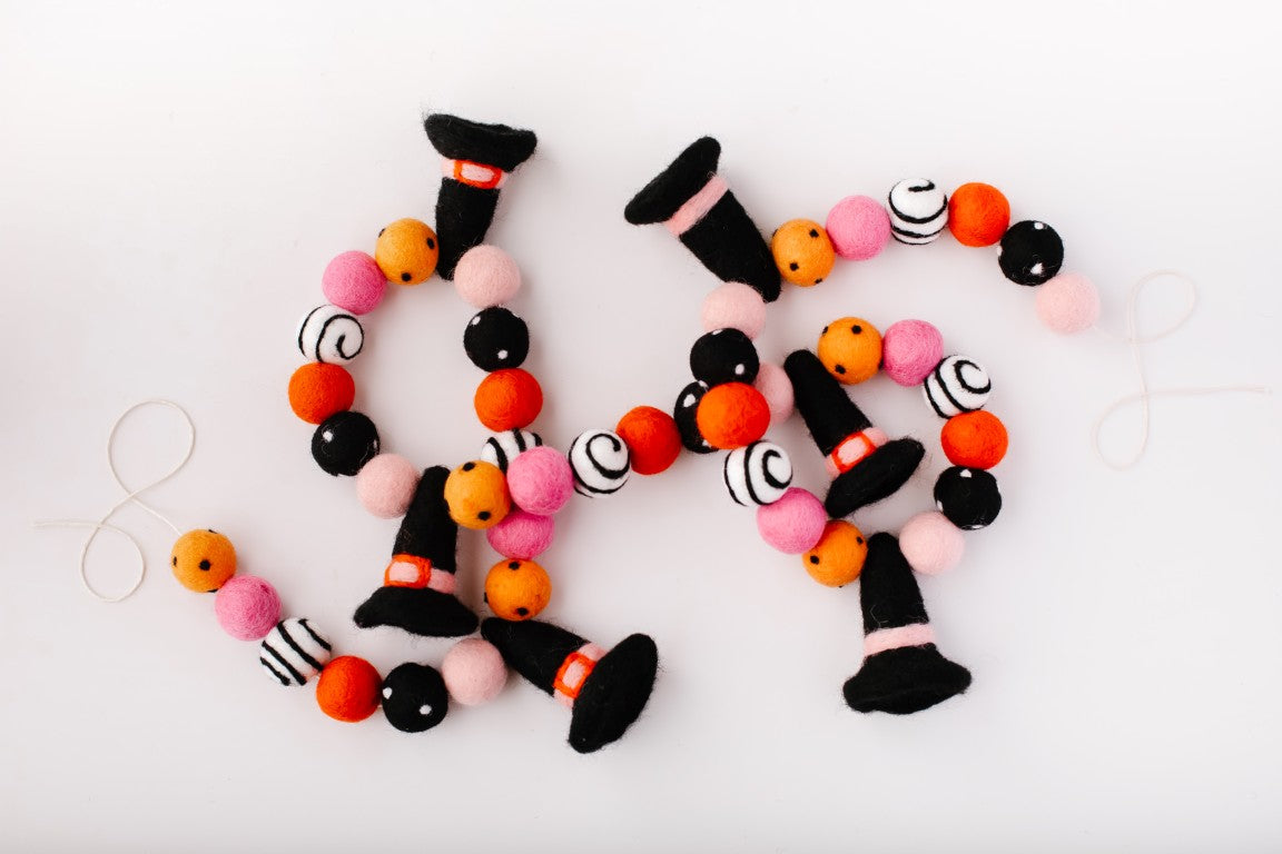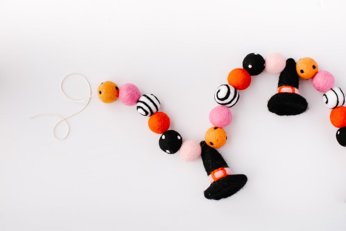 Calling all Witches! Something wickedly cute has arrived —meet the Spellbound Garland! Complete with tiny witch hats and not a spooky bone in sight — she’s girly, playful, and full of Halloween magic! Made for entryway tables, festive shelves, mantle styling, tablescapes, and more. Additional twine is left for each ball to be easily moved and spaced to your desired length.
