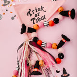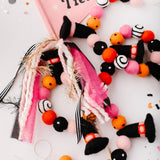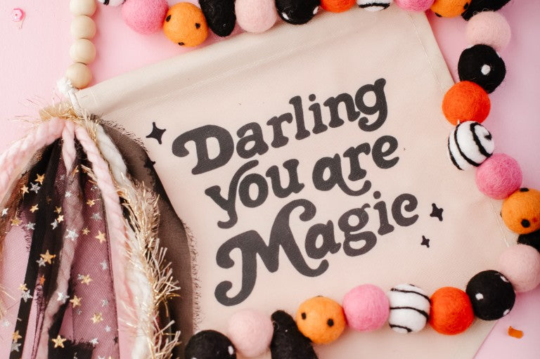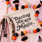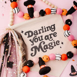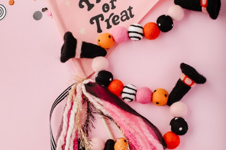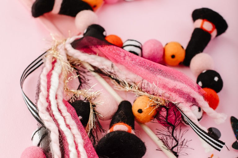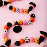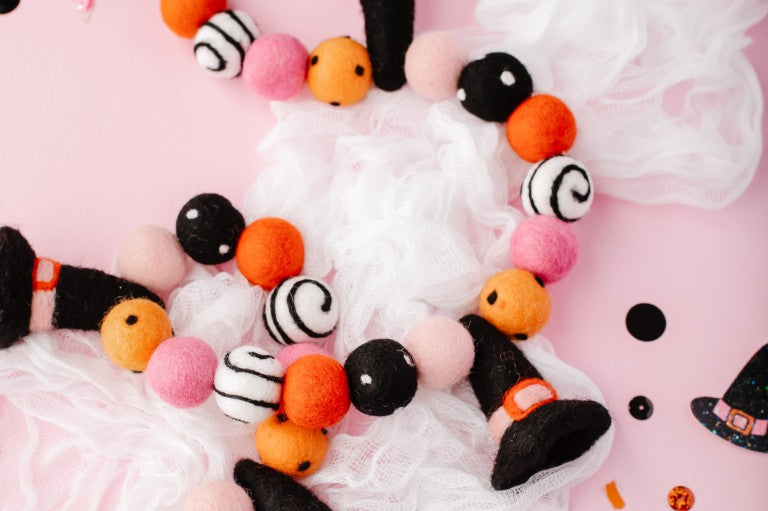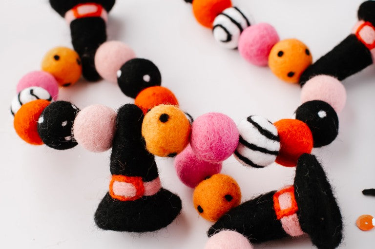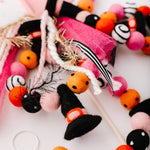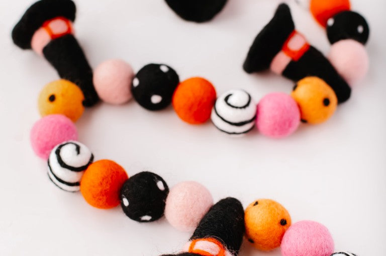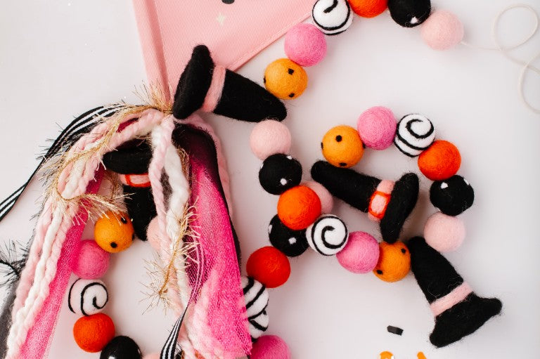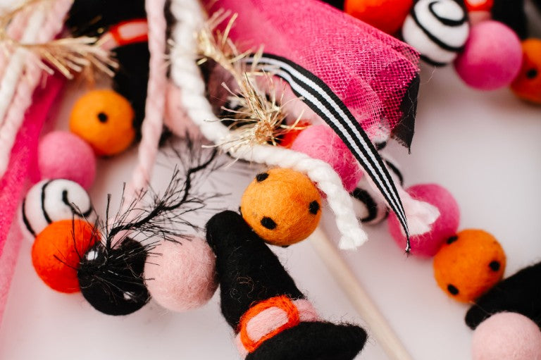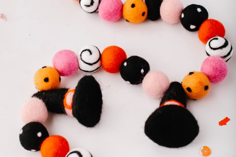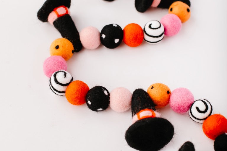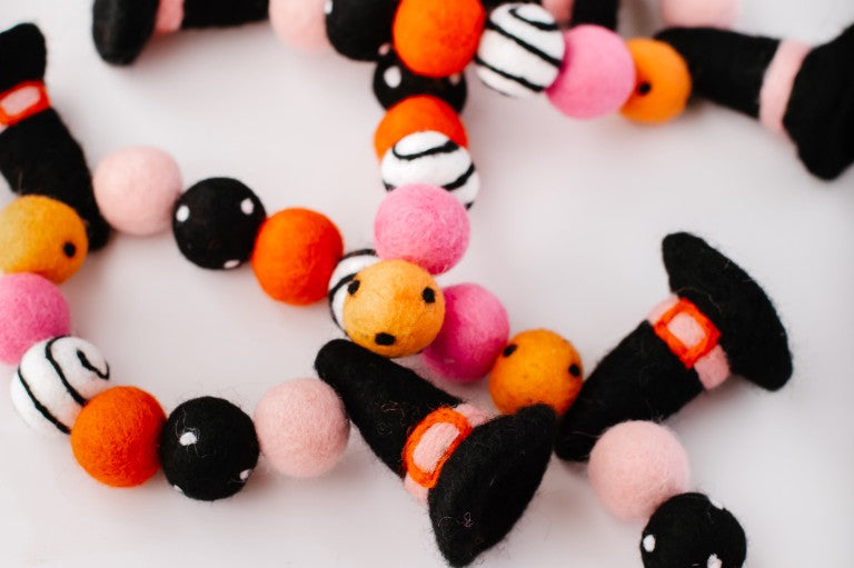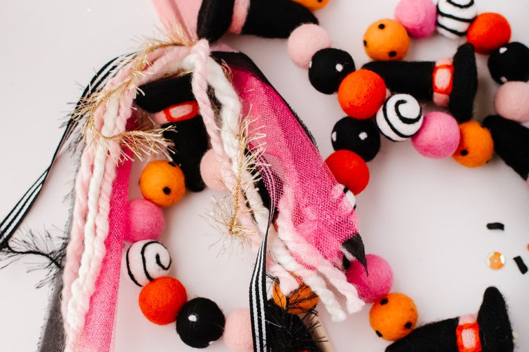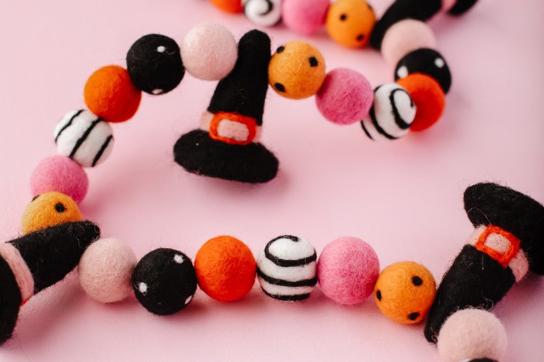 Calling all Witches! Something wickedly cute has arrived —meet the Spellbound Garland! Complete with tiny witch hats and not a spooky bone in sight — she’s girly, playful, and full of Halloween magic! Made for entryway tables, festive shelves, mantle styling, tablescapes, and more. Additional twine is left for each ball to be easily moved and spaced to your desired length.